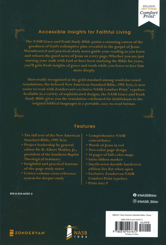 The NASB The Grace and Truth Study Bible has been compiled by a group of scholars and pastors who have taken great care to present the Gospel to all believers, whether they are new to the Christian faith or have been following Christ for most of their lives. The editorial team was led by the president of the Southern Baptist Theological Seminary, Dr. R. Albert Mohler, who has dedicated his life to the faithful distribution of God’s Word throughout the world. The study and observational notes that fill this Bible have a passion and sincerity to them that compel you to read further; a merging of the earnestness in evangelizing the unbeliever and the compassion to warm the heart of a weary believer who has been battered by the struggles of life. A balance is found between the stark truth of God with His graciousness in our pain and this Bible will lead you into a lifelong study of God’s redemptive story.