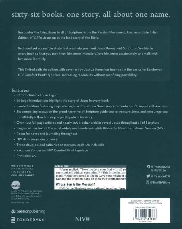 The NIV The Jesus Bible Artist Edition brings together today’s most influential Christian pastors and leaders with God’s Word. This Bible contains over 300 full-page articles and nearly 700 sidebar articles written by scholars and preachers such as Louie Giglio, Max Lucado, and John Piper. These and other helpful tools in this Bible will help you understand God’s plan of salvation throughout all of Scripture.